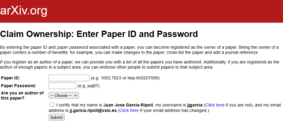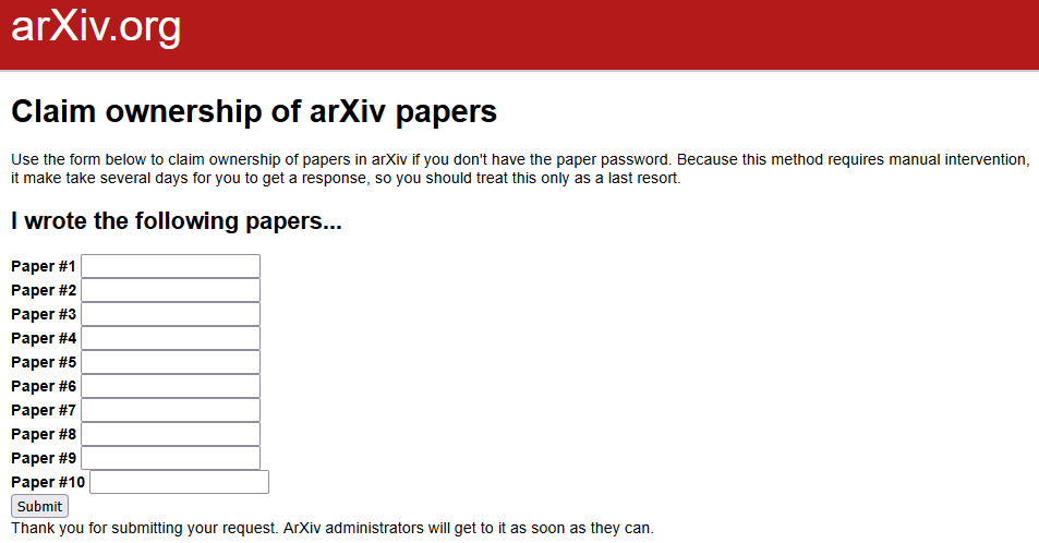 Alternatively, for manuscripts that are very old or whose password has been lost in the unending folders from a university’s webmail, you can collectively claim ownership of manuscripts based on their arXiv code. This is a labor intensive process where someone must verify your claims and it is not the recommended way.