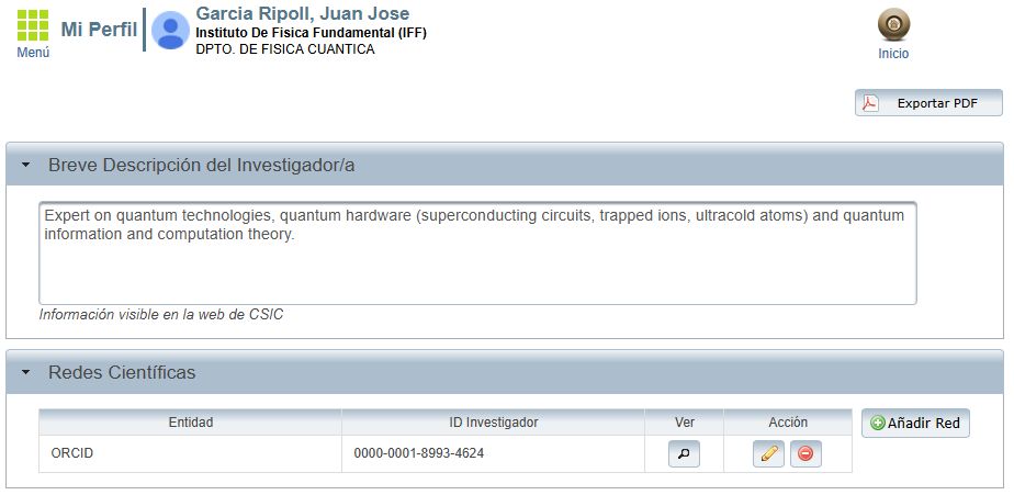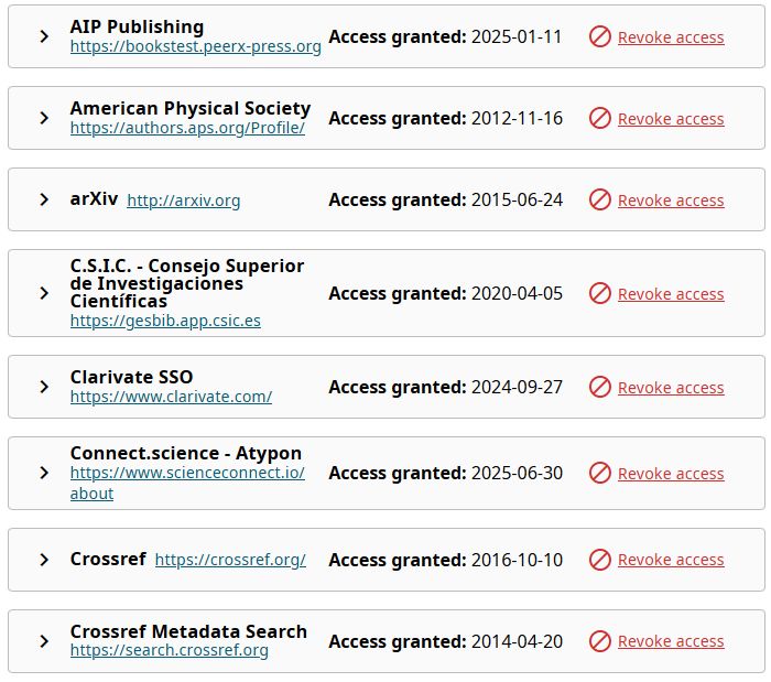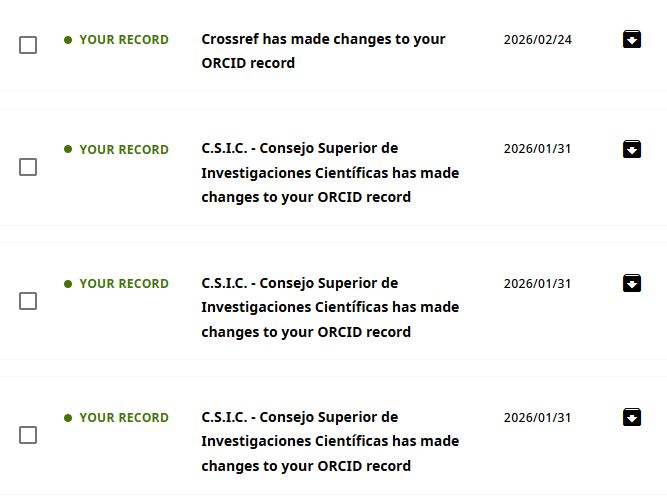 Notice however that this job can also be done by other institutions. In this case, my employer also takes care of updating my publication record. It does so because I entered the ORCId authorization in my personal profile (Intranet – Aplicaciones Corporativas – Información Personal – Mi Perfil), enabling my employer to associate publications that it identifes as mine (and theirs) and keeping that information up to date.